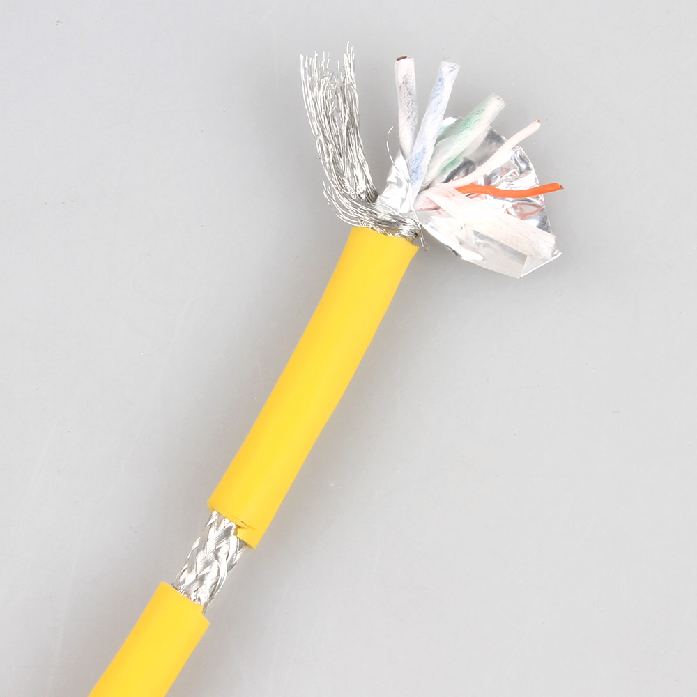 工業用以太網線(xiàn)特(tè)種PVCA絕緣線芯,韌性無紡布可剝離包帶,工業用以太網線導(dǎo)體采用多股(gǔ)細絞和精絞成束細一級無氧銅絲作導體,符(fú)合DIN VDE 0295等級6;工業用以太網線絕緣:聚氯(lǜ)乙烯混合體;工業(yè)用以太網線顏色:彩色線芯或編碼線芯 ≥3芯加黃綠(lǜ)芯線;工業用以太網線屏蔽鍍錫軟銅絲編織,屏蔽密(mì)度≥85%.抗磁抗幹擾。
