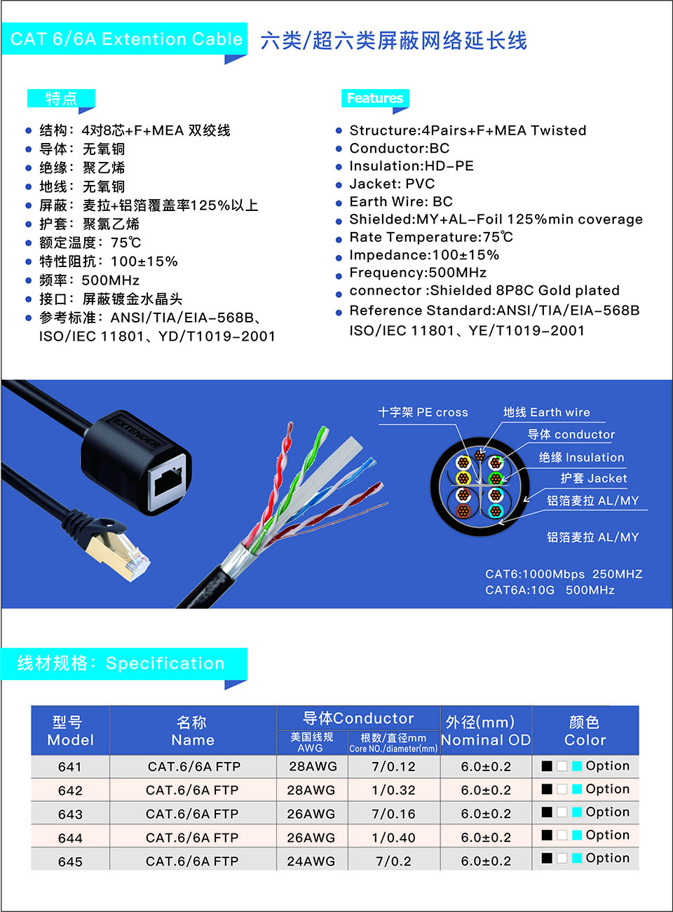 公對母延長(zhǎng)線,公頭是RJ45水晶頭,母頭(tóu)有帶耳延(yán)長線和不(bú)帶耳延長線(xiàn),屏蔽雙絞線電纜是由多對雙絞線和一個塑料外皮構成。屏蔽雙絞線有分(fèn)單屏蔽雙絞線和雙屏(píng)蔽雙絞線,單屏蔽網線是由鋁箔+8芯線(xiàn)+PVC外被組成(chéng),雙(shuāng)屏蔽雙絞線是由(yóu)鋁箔+編織+4對8芯+PVC外(wài)被.