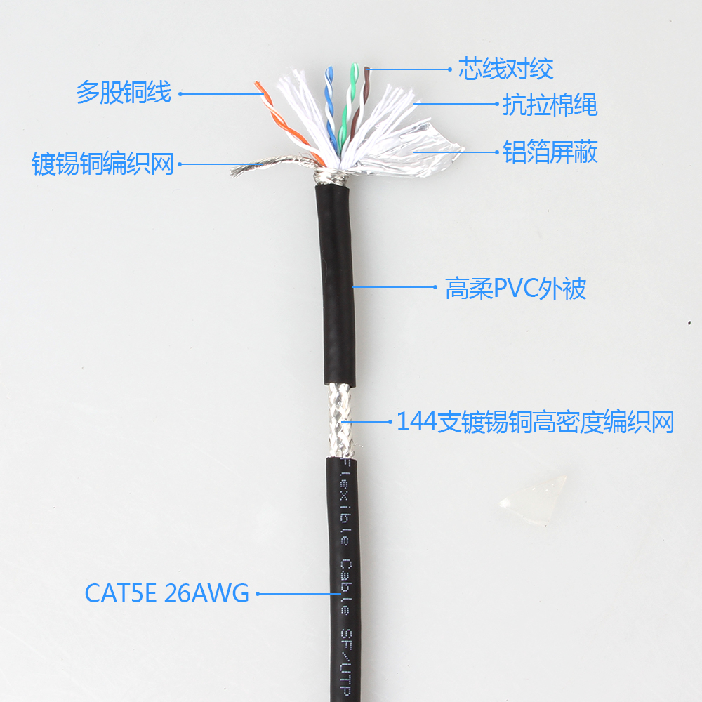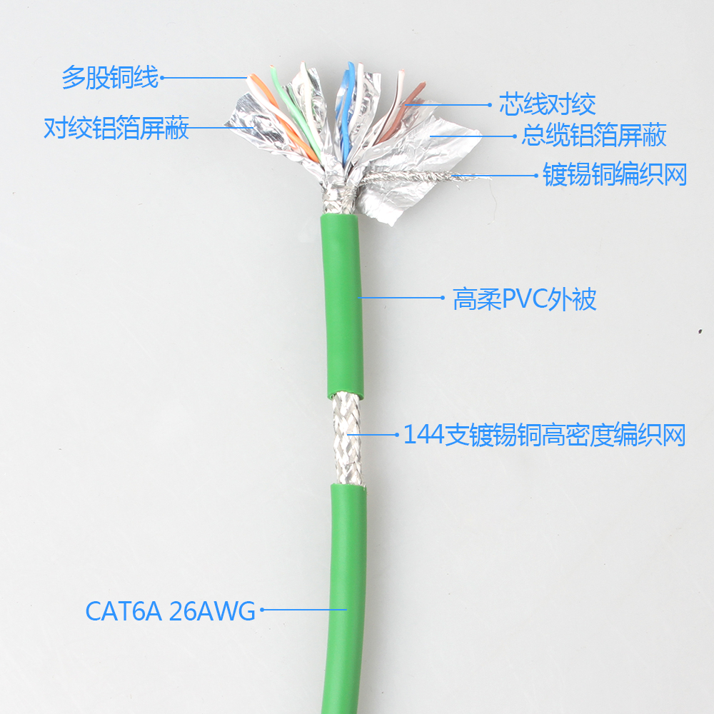 工(gōng)業用以太網(wǎng)線屏蔽鍍錫軟銅絲(sī)編織,屏蔽密度≥85%.抗磁抗幹擾(rǎo)。