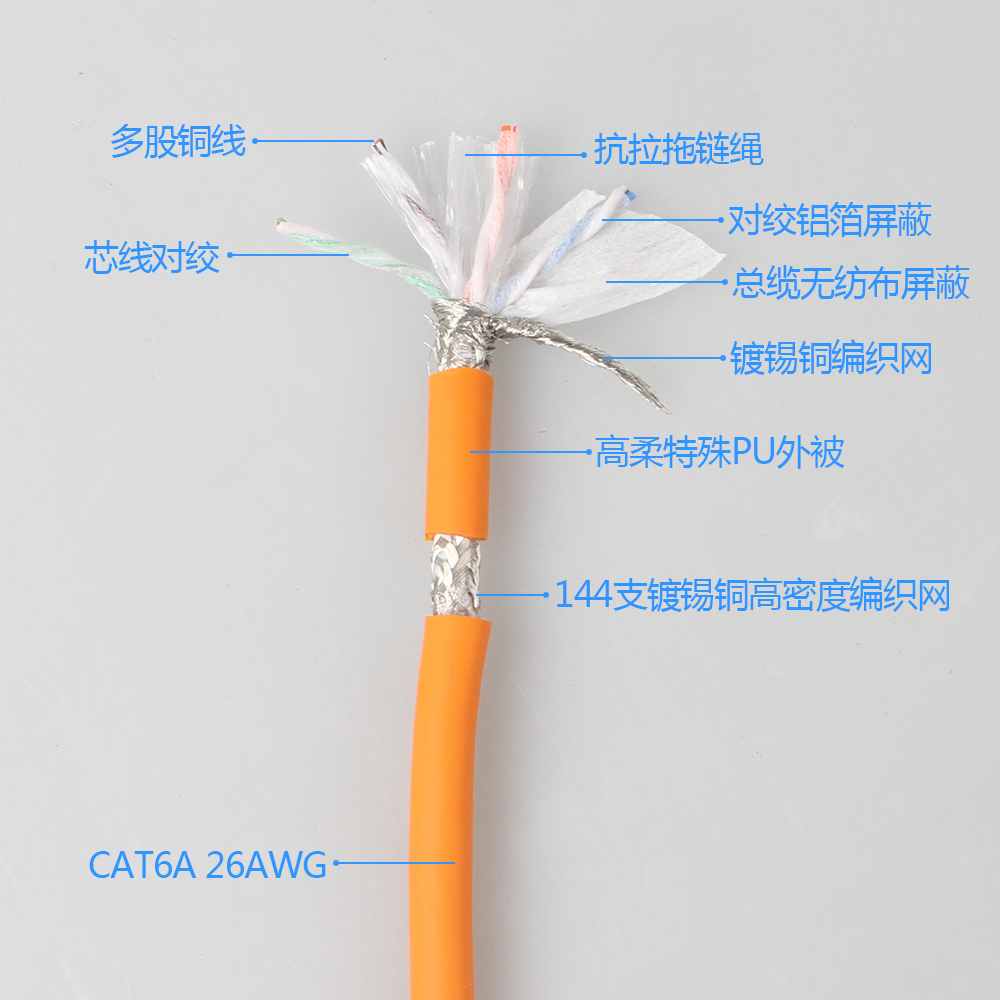 工業用以太(tài)網線特種PVCA絕緣線芯,韌性無紡布(bù)可剝離包(bāo)帶,工(gōng)業用以太網線導(dǎo)體采用(yòng)多股細絞和精絞成束細一級無氧銅(tóng)絲作導(dǎo)體,符合DIN VDE 0295等(děng)級6;